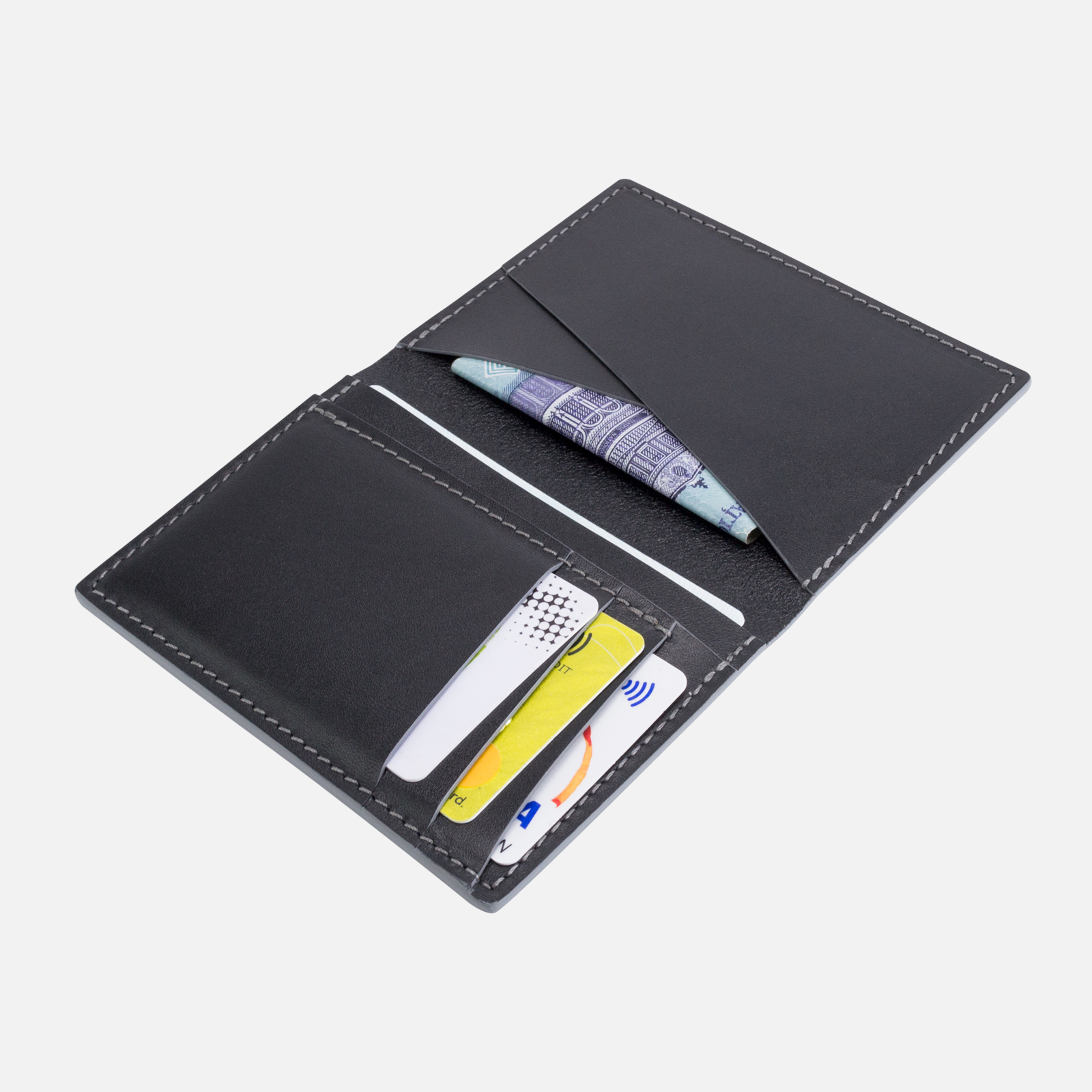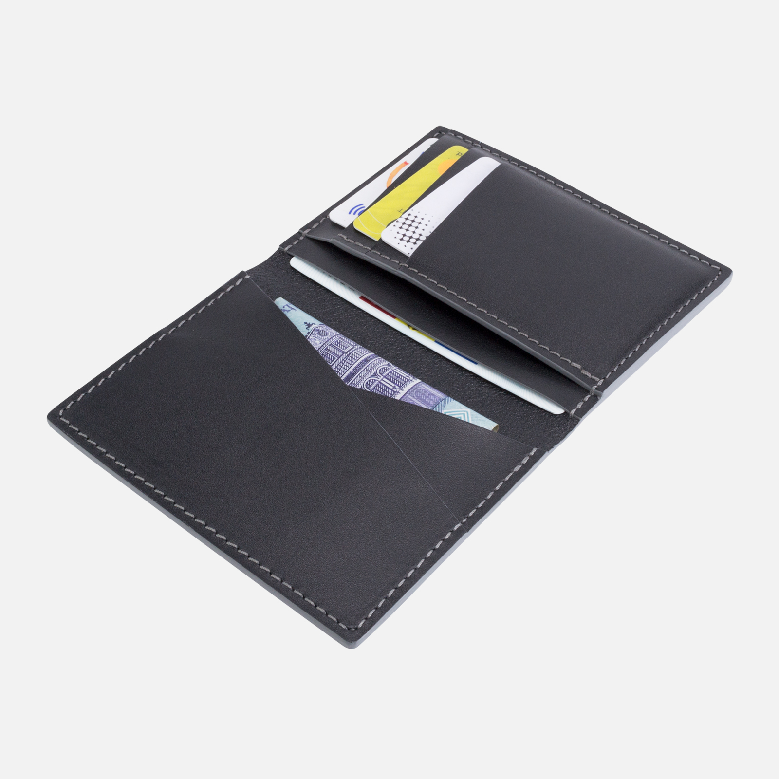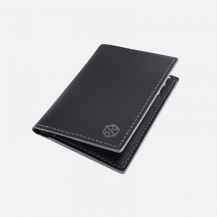 Portofel SLIM din piele naturala pentru barbati lucrat in regim de manufactura. Este un portofel de tip inalt, practic si modern. Portofelul este facut dintr-o piele neagra tabacita semivegetal cu o usoara textura pe suprafata acesteia. Pentru un plus de contrast portofelul este cusut cu ata de culoare gri iar marginile sunt finisate cu vopsea de cant gri.